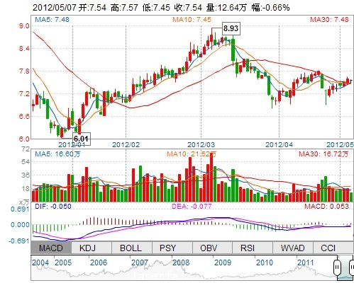今 開: 7.54 成交量: 126437手 振 幅: 1.58% 最 高: 7.57 成交額: 9506.41萬(wan) 換手率: 1.34% 最 低: 7.45 總市值: 78.75億(yi) 市淨率: 2.65 昨 收: 7.59 流通市值...