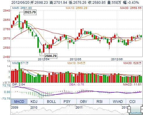| 昨 收: | 2692.34 | 成交量: | 5584465手 |
