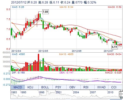 今 開: 6.20 成交量: 6770手 振 幅: 2.73% 最 高: 6.28 成交額: 419.83萬(wan) 換手率: 0.39% 最 低: 6.11 總市值: 10.84億(yi) 市淨率: 2.68 昨 收: 6.22 流通市值: ...