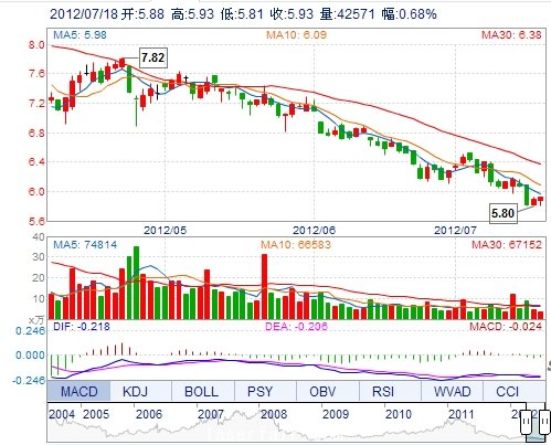 今 開: 5.88 成交量: 42571手 振 幅: 2.04% 最 高: 5.93 成交額: 2497.51萬(wan) 換手率: 0.45% 最 低: 5.81 總市值: 61.93億(yi) 市淨率: 2.08 昨 收: 5.89 流通市值...