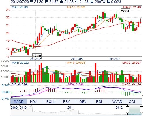 今 開: 21.30 成交量: 26078手 振 幅: 2.99% 最 高: 21.87 成交額: 5649.61萬(wan) 換手率: 1.27% 最 低: 21.23 總市值: 63.64億(yi) 市淨率: 5.24 昨 收: 21.38 流通...