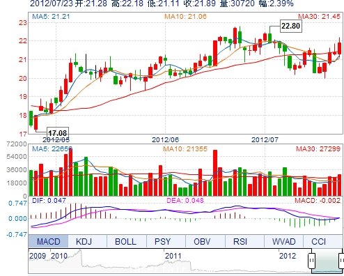 今 開: 21.28 成交量: 30719手 振 幅: 5.00% 最 高: 22.18 成交額: 6693.24萬(wan) 換手率: 1.50% 最 低: 21.11 總市值: 65.16億(yi) 市淨率: 5.37 昨 收: 21.38 流通...