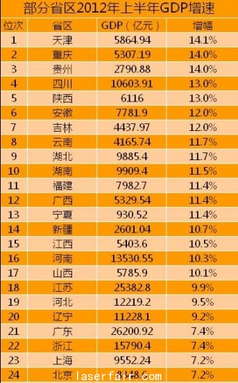 7月24日電 (財經頻道 李金磊)根據各省(自治區、直轄市)統計局網站公布的數據統計發現,截至7月23日,全國已有24個(ge) 省份公布了2012年上半年GDP增速。其中,天津上半年GDP增速最高,為(wei) 14.1%,而北京和上海排名墊底,GDP增速僅(jin) 為(wei) 7.2%。