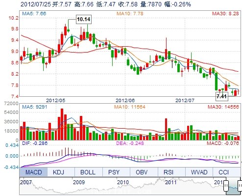 今 開: 7.57 成交量: 7870手 振 幅: 2.50% 最 高: 7.66 成交額: 595.11萬(wan) 換手率: 0.41% 最 低: 7.47 總市值: 15.10億(yi) 市淨率: 3.13 昨 收: 7.60 流通市值: ...