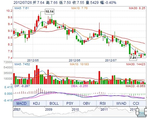 今 開: 7.64 成交量: 5428手 振 幅: 2.11% 最 高: 7.66 成交額: 412.14萬(wan) 換手率: 0.28% 最 低: 7.50 總市值: 15.04億(yi) 市淨率: 3.12 昨 收: 7.58 流通市值: ...
