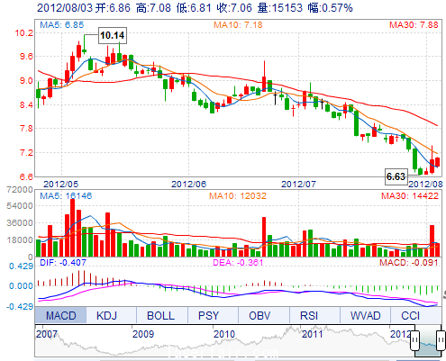 今 開: 6.86 成交量: 15153手 振 幅: 3.85% 最 高: 7.08 成交額: 1054.29萬(wan) 換手率: 0.78% 最 低: 6.81 總市值: 14.07億(yi) 市淨率: 2.92 昨 收: 7.02 流通市值...