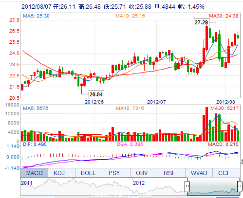 | 今 開: | 26.11 | 成交量: | 4843手 | 振 幅: | 2.93% |