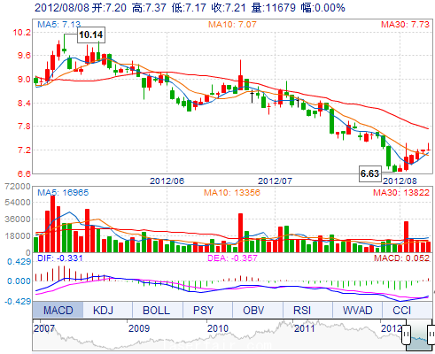 今 開: 7.20 成交量: 11678手 振 幅: 2.77% 最 高: 7.37 成交額: 845.48萬(wan) 換手率: 0.60% 最 低: 7.17 總市值: 14.37億(yi) 市淨率: 2.98 昨 收: 7.21 流通市值:...