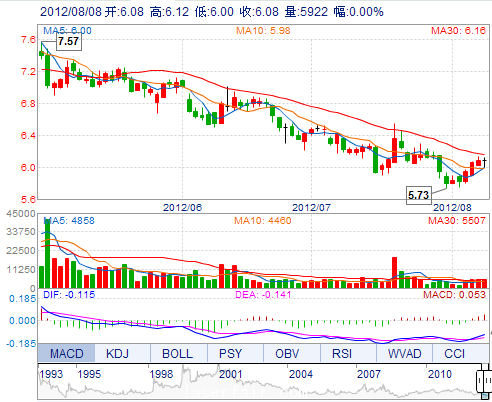 | 昨 收: | 6.08 | 流通市值: | 10.56億(yi) | 市盈率TTM: | -- |