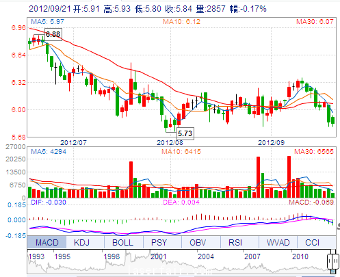 今 開: 5.91 成交量: 2856手 振 幅: 2.22% 最 高: 5.93 成交額: 168.30萬(wan) 換手率: 0.16% 最 低: 5.80 總市值: 10.14億(yi) 市淨率: 2.51 昨 收: 5.85 流通市值: ...