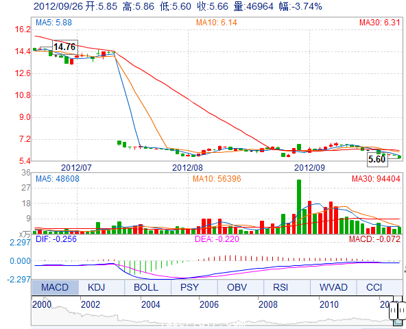 今 開: 5.85 成交量: 46964手 振 幅: 4.42% 最 高: 5.86 成交額: 2687.74萬(wan) 換手率: 0.53% 最 低: 5.60 總市值: 50.44億(yi) 市淨率: 0.97 昨 收: 5.88 流通市值...