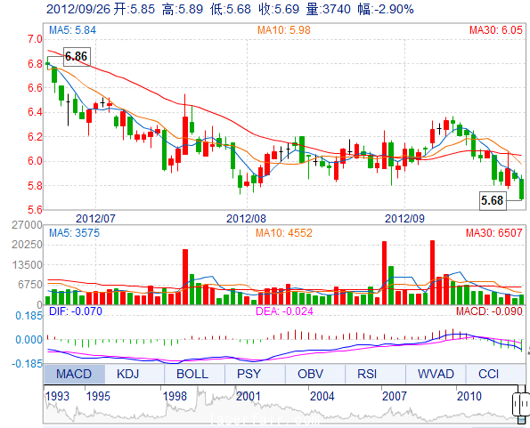 今 開: 5.85 成交量: 3740手 振 幅: 3.58% 最 高: 5.89 成交額: 215.83萬(wan) 換手率: 0.22% 最 低: 5.68 總市值: 9.88億(yi) 市淨率: 2.45 昨 收: 5.86 流通市值: 9...