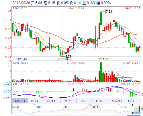 今 開: 6.06 成交量: 9162手 振 幅: 1.64% 最 高: 6.15 成交額: 560.12萬(wan) 換手率: 0.33% 最 低: 6.05 總市值: 17.50億(yi) 市淨率: 2.91 昨 收: 6.08 流通市值: ...