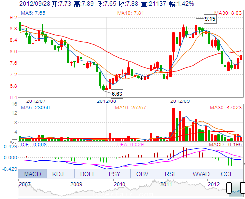 今 開: 7.73 成交量: 21136手 振 幅: 3.09% 最 高: 7.89 成交額: 1642.35萬(wan) 換手率: 1.09% 最 低: 7.65 總市值: 15.70億(yi) 市淨率: 3.20 昨 收: 7.77 流通市值...