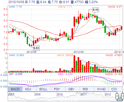 今 開: 7.79 成交量: 47703手 振 幅: 3.74% 最 高: 8.04 成交額: 3776.85萬(wan) 換手率: 2.46% 最 低: 7.75 總市值: 15.96億(yi) 市淨率: 3.26 昨 收: 7.76 流通市值...