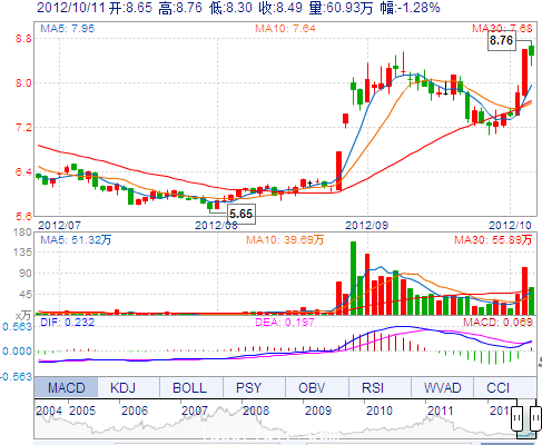 | 今 開: | 8.65 | 成交量: | 609325手 | 振 幅: | 5.35% |
