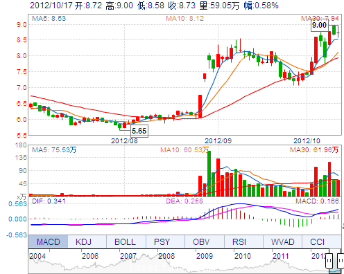 今 開: 8.72 成交量: 590514手 振 幅: 4.84% 最 高: 9.00 成交額: 51907.15萬(wan) 換手率: 6.24% 最 低: 8.58 總市值: 91.18億(yi) 市淨率: 3.25 昨 收: 8.68 流通市...