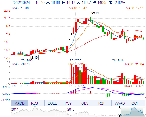 | 今 開: | 16.40 | 成交量: | 14005手 | 振 幅: | 2.91% |