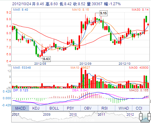 今 開: 8.46 成交量: 39367手 振 幅: 2.09% 最 高: 8.60 成交額: 3344.14萬(wan) 換手率: 2.03% 最 低: 8.42 總市值: 16.98億(yi) 市淨率: 3.42 昨 收: 8.63 流通市值...