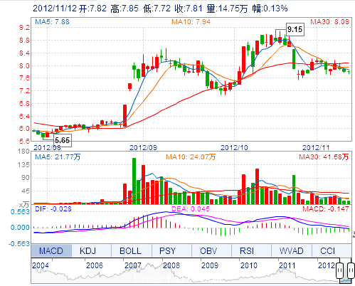 | 今 開: | 7.82 | 成交量: | 147461手 | 振 幅: | 1.67% |