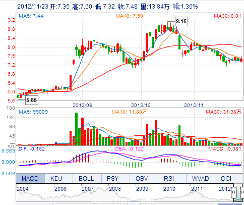 今 開: 7.35 成交量: 138368手 振 幅: 3.79% 最 高: 7.60 成交額: 10372.87萬(wan) 換手率: 1.46% 最 低: 7.32 總市值: 78.12億(yi) 市淨率: 2.41 昨 收: 7.38 流通市...
