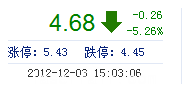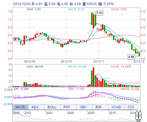 | 今 開: | 4.91 | 成交量: | 5.05萬(wan) 手 | 振 幅: | 6.88% |