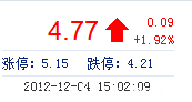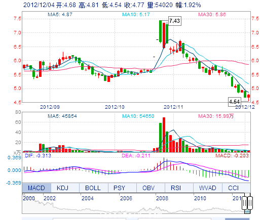 | 今 開: | 4.68 | 成交量: | 5.40萬(wan) 手 | 振 幅: | 5.77% |