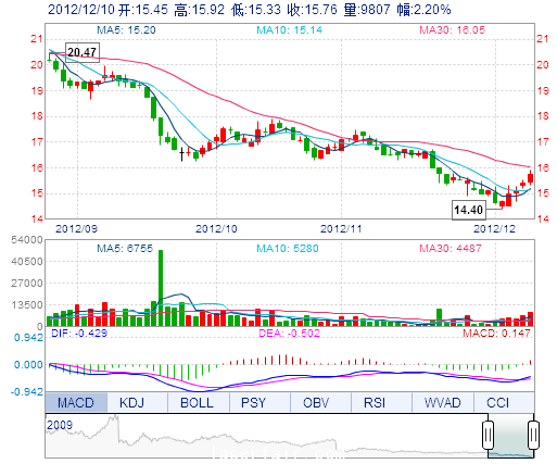 今 開: 15.45 成交量: 9807手 振 幅: 3.83% 最 高: 15.92 成交額: 1525.86萬(wan) 元 換手率: 0.76% 最 低: 15.33 總市值: 67.33億(yi) 市淨率: 4.61 昨 收: 15.42 流通...