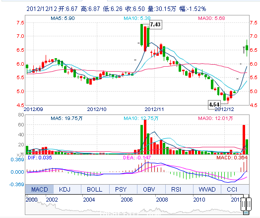 今開: 6.67 成交量: 30.15萬(wan) 手 振幅: 9.24% 最高: 6.87 成交額: 1.94億(yi) 元 換手率: 6.90% 最低: 6.26 總市值: 28.39億(yi) 市淨率: 2.11 昨收: 6.60 流通市值: 28...