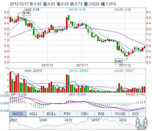 今 開: 6.66 成交量: 3.12萬(wan) 手 振 幅: 3.00% 最 高: 6.85 成交額: 2099.53萬(wan) 元 換手率: 1.61% 最 低: 6.65 總市值: 13.41億(yi) 市淨率: 2.70 昨 收: 6.66 流通市...