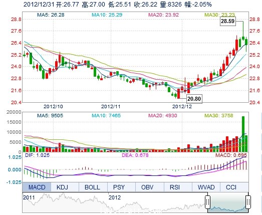 | 今 開: | 26.77 | 成交量: | 8326手 | 振 幅: | 5.57% |