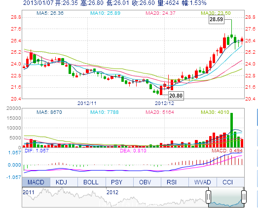 今 開: 26.35 成交量: 4624手 振 幅: 3.02% 最 高: 26.80 成交額: 1226.99萬(wan) 元 換手率: 4.42% 最 低: 26.01 總市值: 9.31億(yi) 市淨率: 3.24 昨 收: 26.20 流通...