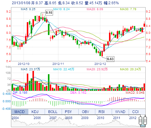 今 開: 8.37 成交量: 45.14萬(wan) 手 振 幅: 3.73% 最 高: 8.65 成交額: 3.85億(yi) 元 換手率: 4.77% 最 低: 8.34 總市值: 88.98億(yi) 市淨率: 2.75 昨 收: 8.30 流通市值...