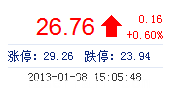 今 開: 26.50 成交量: 6094手 振 幅: 3.95% 最 高: 27.45 成交額: 1640.44萬(wan) 元 換手率: 5.82% 最 低: 26.40 總市值: 9.37億(yi) 市淨率: 3.26 昨 收: 26.60 流通...