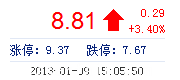 今 開: 8.49 成交量: 51.37萬(wan) 手 振 幅: 6.46% 最 高: 9.00 成交額: 4.53億(yi) 元 換手率: 5.43% 最 低: 8.45 總市值: 92.01億(yi) 市淨率: 2.84 昨 收: 8.52 流通市值...