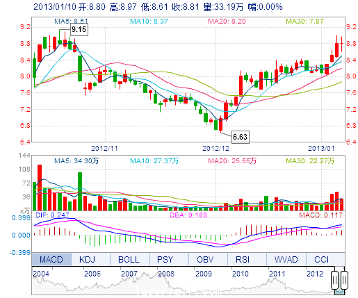 | 今 開: | 8.80 | 成交量: | 33.19萬(wan) 手 | 振 幅: | 4.09% |
