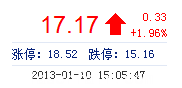 | 最 高: | 17.19 | 成交額: | 1769.13萬(wan) 元 | 換手率: | 0.31% |