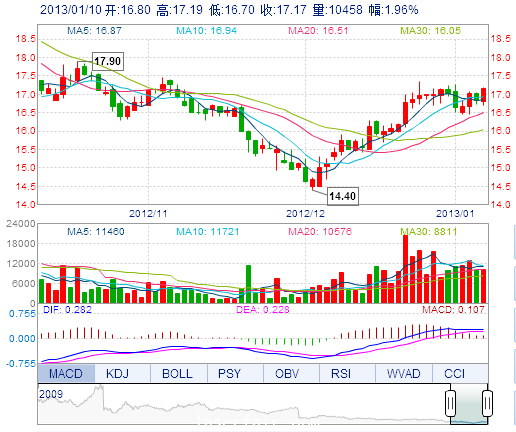 今 開: 16.80 成交量: 1.05萬(wan) 手 振 幅: 2.91% 最 高: 17.19 成交額: 1769.13萬(wan) 元 換手率: 0.31% 最 低: 16.70 總市值: 73.35億(yi) 市淨率: 5.02 昨 收: 16.84 流...