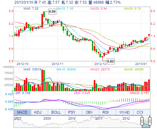 今 開: 7.45 成交量: 4.90萬(wan) 手 振 幅: 3.42% 最 高: 7.57 成交額: 3654.09萬(wan) 元 換手率: 2.52% 最 低: 7.32 總市值: 14.98億(yi) 市淨率: 3.02 昨 收: 7.32 流通市...