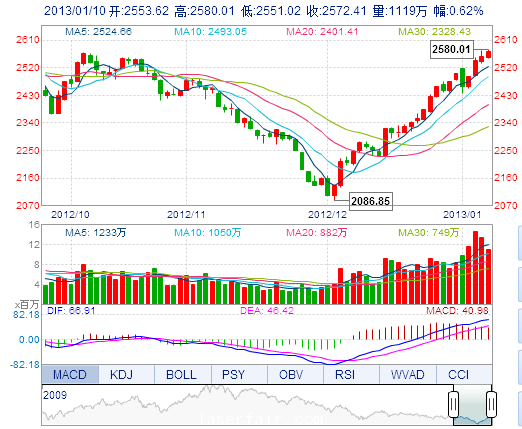 今 開: 2553.62 最 高: 2580.01 昨 收: 2556.64 最 低: 2551.02 成交量: 1119.22萬(wan) 手 振 幅: 1.13% 成交額: 109.61億(yi) 元