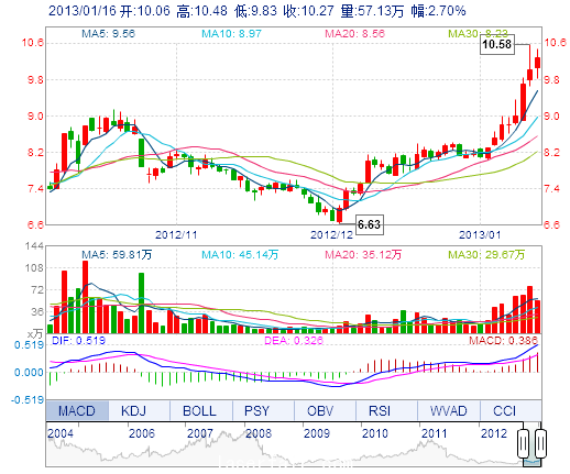 | 最 高: | 10.48 | 成交額: | 5.80億(yi) 元 | 換手率: | 6.04% |