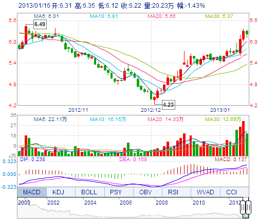 | 今 開: | 6.31 | 成交量: | 20.23萬(wan) 手 | 振 幅: | 3.65% |