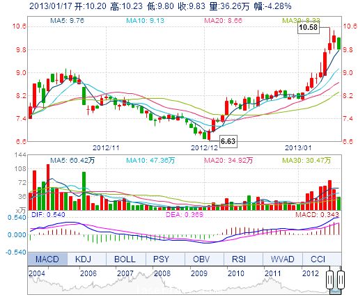 | 最 高: | 10.23 | 成交額: | 3.61億(yi) 元 | 換手率: | 3.83% |