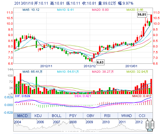 今開: 10.11 成交量: 89.02萬(wan) 手 振幅: 7.12% 最高: 10.81 成交額: 9.46億(yi) 元 換手率: 9.41% 最低: 10.11 總市值: 112.90億(yi) 市淨率: 3.49 昨收: 9.83 流通市值...