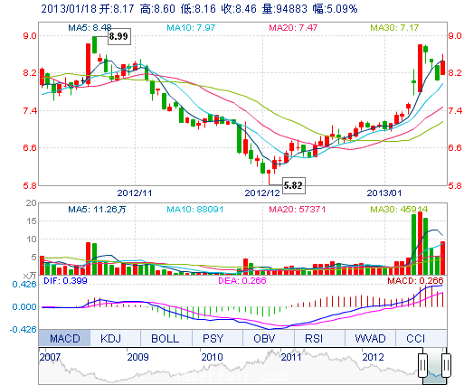 | 今 開: | 8.17 | 成交量: | 9.49萬(wan) 手 | 振 幅: | 5.47% |