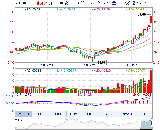 今開: 31.00 成交量: 11.05萬(wan) 手 振幅: 8.23% 最高: 33.00 成交額: 3.50億(yi) 元 換手率: 4.01% 最低: 30.49 總市值: 97.33億(yi) 市淨率: 7.47 昨收: 30.50 流通市值...