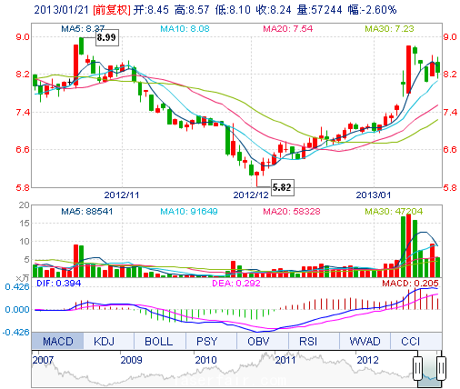 | 今 開: | 8.45 | 成交量: | 5.72萬(wan) 手 | 振 幅: | 5.56% |
