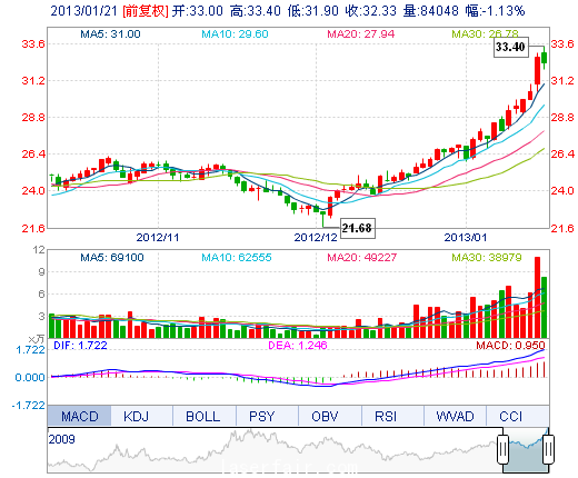 今開: 33.00 成交量: 8.40萬(wan) 手 振幅: 4.59% 最高: 33.40 成交額: 2.74億(yi) 元 換手率: 3.05% 最低: 31.90 總市值: 96.23億(yi) 市淨率: 7.38 昨收: 32.70 流通市值:...