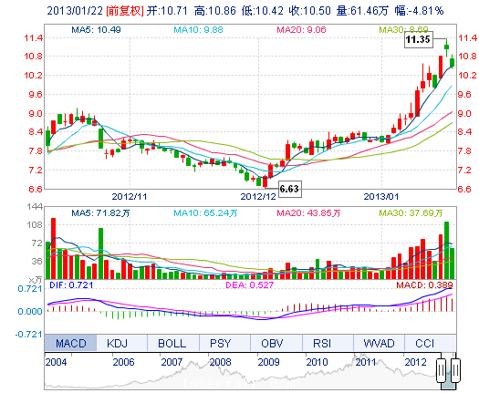 | 最 高: | 10.86 | 成交額: | 6.53億(yi) 元 | 換手率: | 6.50% |