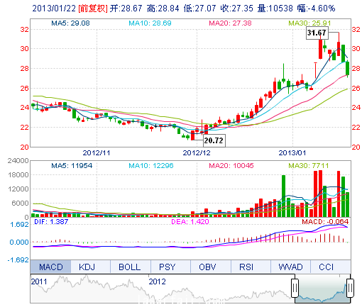 | 今 開: | 28.67 | 成交量: | 1.05萬(wan) 手 | 振 幅: | 6.17% |